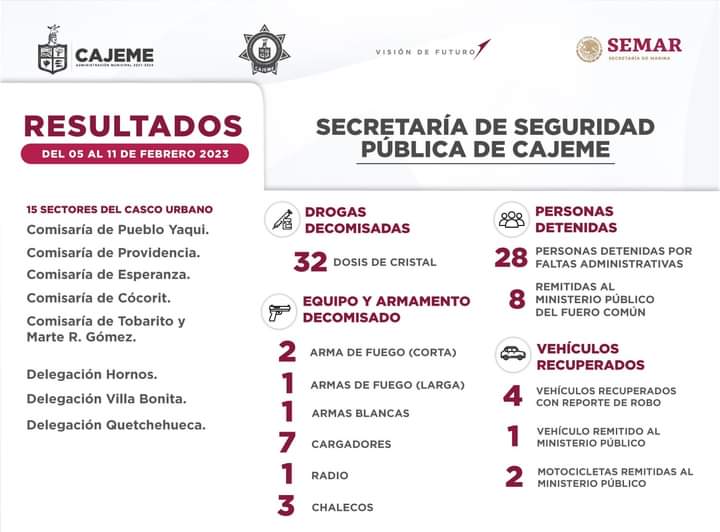 Las acciones de la Secretaría de Seguridad Pública en Cajeme dieron como resultado un total de 36 personas detenidas por elementos de la Policía Municipal en coordinación con la Secretaría de Marina y las diversas corporaciones, de los cuales 28 fueron por faltas administrativas y 8 se turnaron al Ministerio Público del Fuero Común.