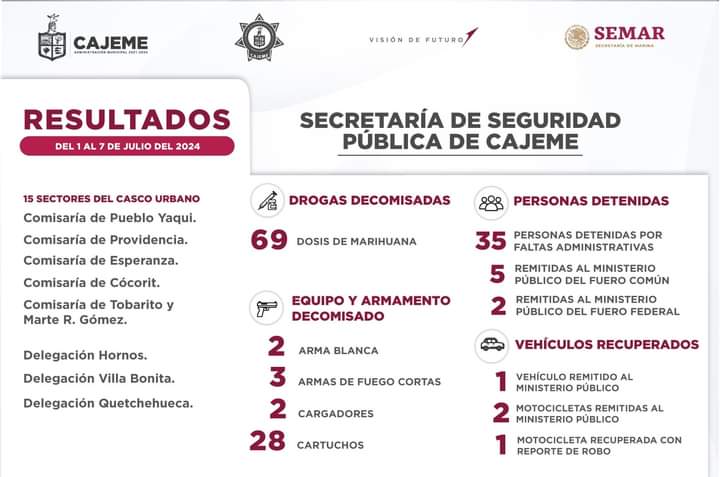 Las acciones de la Secretaría de Seguridad Pública en Cajeme dieron como resultado un total de 42 personas detenidas por elementos de la Policía Municipal en coordinación con la Secretaría de Marina y las diversas corporaciones, de los cuales 35 fueron por faltas administrativas, 5 se turnaron al Ministerio Público del Fuero Común y 2 al Federal.