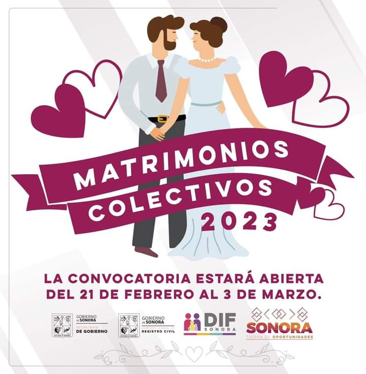 El Gobierno de Sonora en coordinación con Registro Civil, DIF Sonora y DIF Cajeme, invitan a todas las parejas que deseen formalizar su matrimonio, a aprovechar esta oportunidad de sumarse a los Matrimonios Colectivos y consolidar su unión de forma legal con la participación del gobierno del estado.