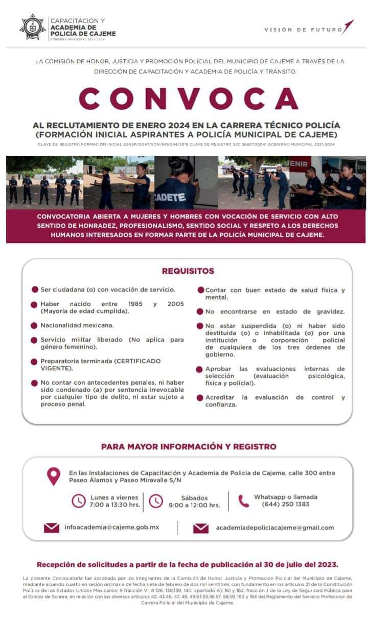 El Ayuntamiento de Cajeme a través de la Secretaría de Seguridad Pública Municipal convoca a hombres y mujeres con vocación de servicio a la sociedad que deseen formar parte de la corporación policial, a participar en la nueva convocatoria para aspirantes a cadetes de la Academia de Policía.