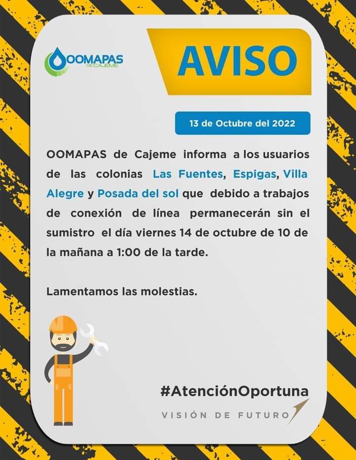 CAJEME SE SUSPENDERÁ MAÑANA VIERNES 14 DE OCTUBRE EN ESTA ZONA DE CIUDAD OBREGÓN EL SUMINISTRO DE AGUA. by admin 14 de octubre de 2022 written by admin 14 de octubre de 2022 0 SE SUSPENDERÁ VIERNES 14 DE OCTUBRE EN ESTA ZONA DE CIUDAD OBREGÓN EL SUMINISTRO DE AGUA. TOP5 0 comments 0 FacebookTwitterPinterestEmail admin previous post SU ESPOSO LA ENGAÑÓ CON SU SECRETARIA ECHÓ A PERDER MATRIMONIO DE CASI 2 AÑOS next post Si ofrecemos, cumplimos: Alfonso Durazo You may also like INICIA CON GRAN ÉXITO LA EXPO CACTUS Y... 26 de octubre de 2024 ALISTA UMPC Y SSPM OPERATIVOS POR LAS FESTIVIDADES... 24 de octubre de 2024 CONTROLA BOMBEROS 1NCENDI0 DE CASA EN LA BELLAVISTA 24 de octubre de 2024 Recibe Congreso de Sonora reconocimiento al mérito archivístico 24 de octubre de 2024 RECIBE JAVIER LAMARQUE RECONOCIMIENTO AL MÉRITO ARCHIVÍSTICO PARA... 24 de octubre de 2024 REHABILITA SECRETARÍA DE BIENESTAR ESPACIO DEPORTIVO EN LA... 24 de octubre de 2024 COLOCAN TRADICIONAL ALTAR EN HOMENAJE A LOS POLICÍAS... 24 de octubre de 2024 ENTREGAN UNIFORMES A CADETES DE LA ACADEMIA DE... 22 de octubre de 2024 SE REÚNE PRESIDENTE JAVIER LAMARQUE CON RECTORA DE... 22 de octubre de 2024 JAVIER LAMARQUE REGRESA A SU ALMA MATER PARA... 22 de octubre de 2024
