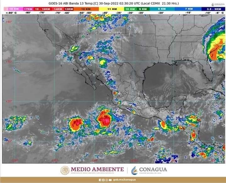 Sus bandas nubosas reforzarán las condiciones para chubascos (de 5 a 25 milímetros [mm]) y lluvias fuertes (de 25 a 50 mm) con rachas de viento de 40 a 50 kilómetros por hora (km/h) en Colima, Jalisco y Michoacán.