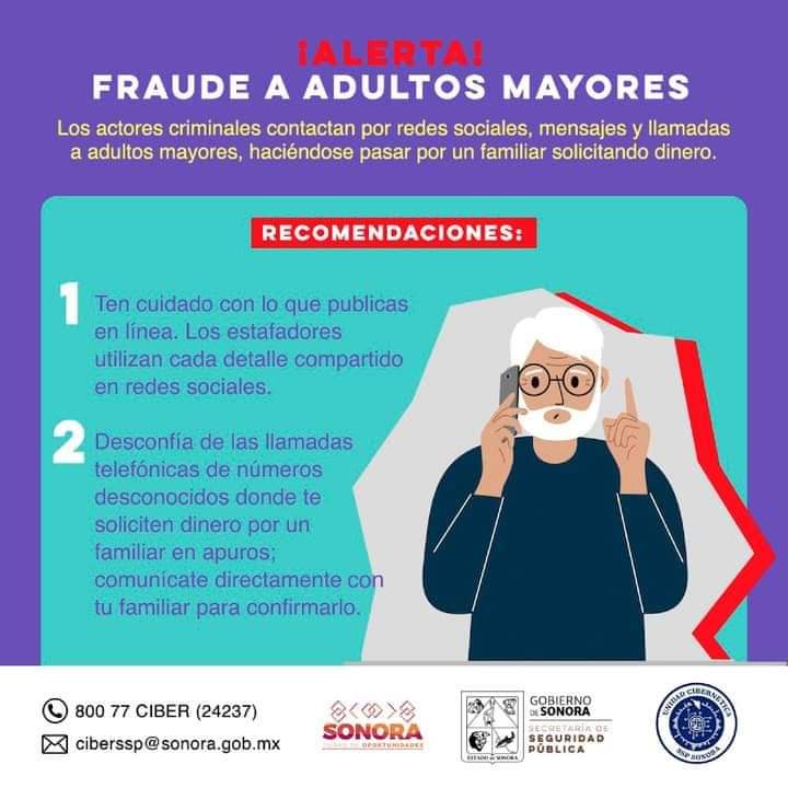 Hermosillo, Sonora; 13 de febrero de 2023.-* Un llamado a extremar medidas de prevención para que personas adultas no sean víctimas de estafadores, hizo la Secretaría de Seguridad Pública (SSP) del Gobierno de Sonora a través de la Unidad Cibernética.