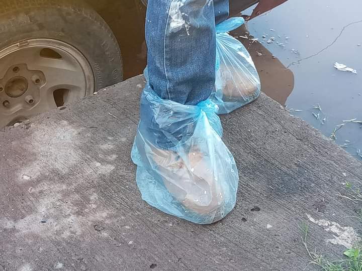 Sin embargo, un vecino de dicho lugar nos compartió una forma creativa para poder salir de su casa y cuidar su calzado de las inundaciones, forrando su zapato con una bolsa.